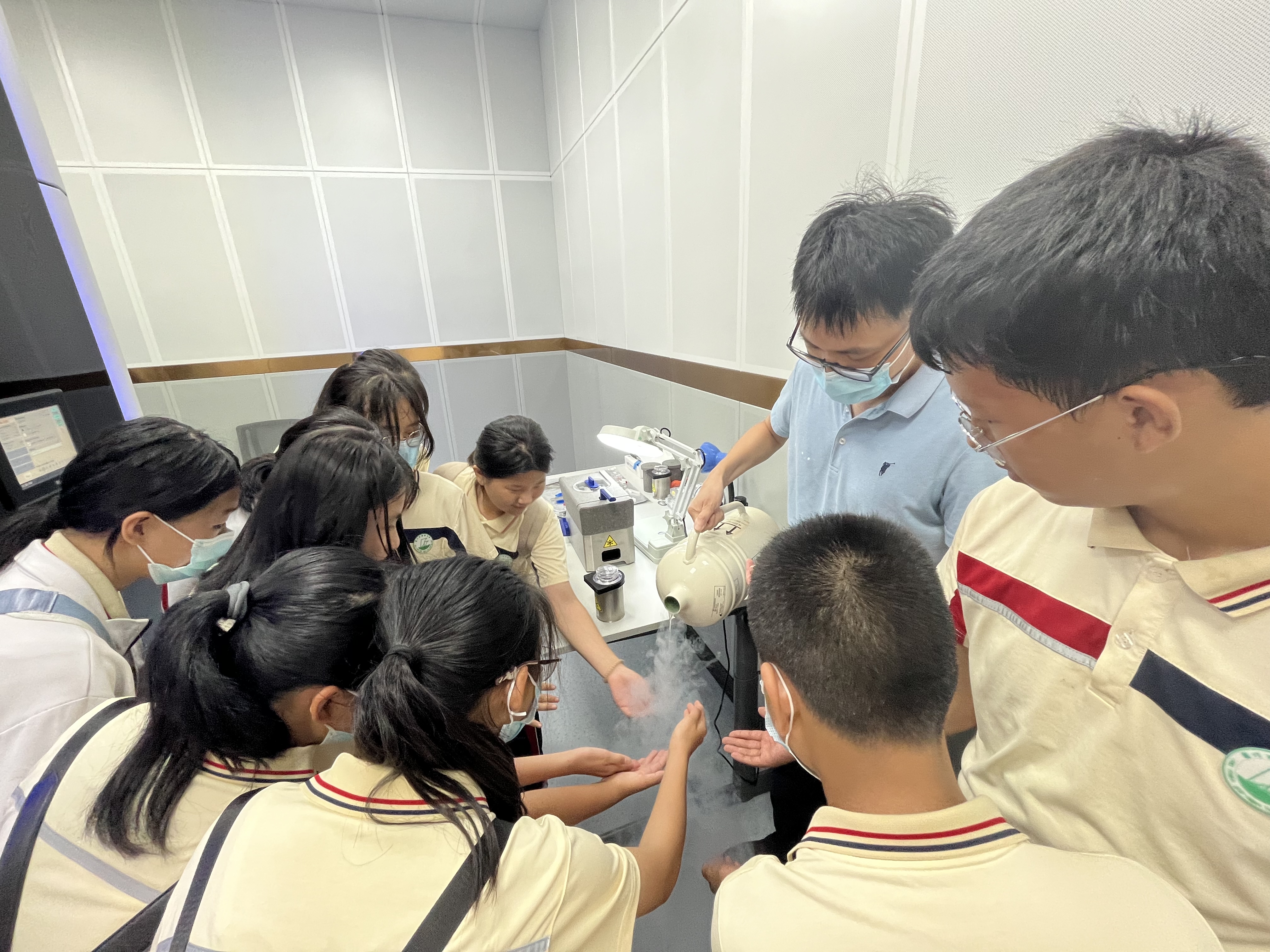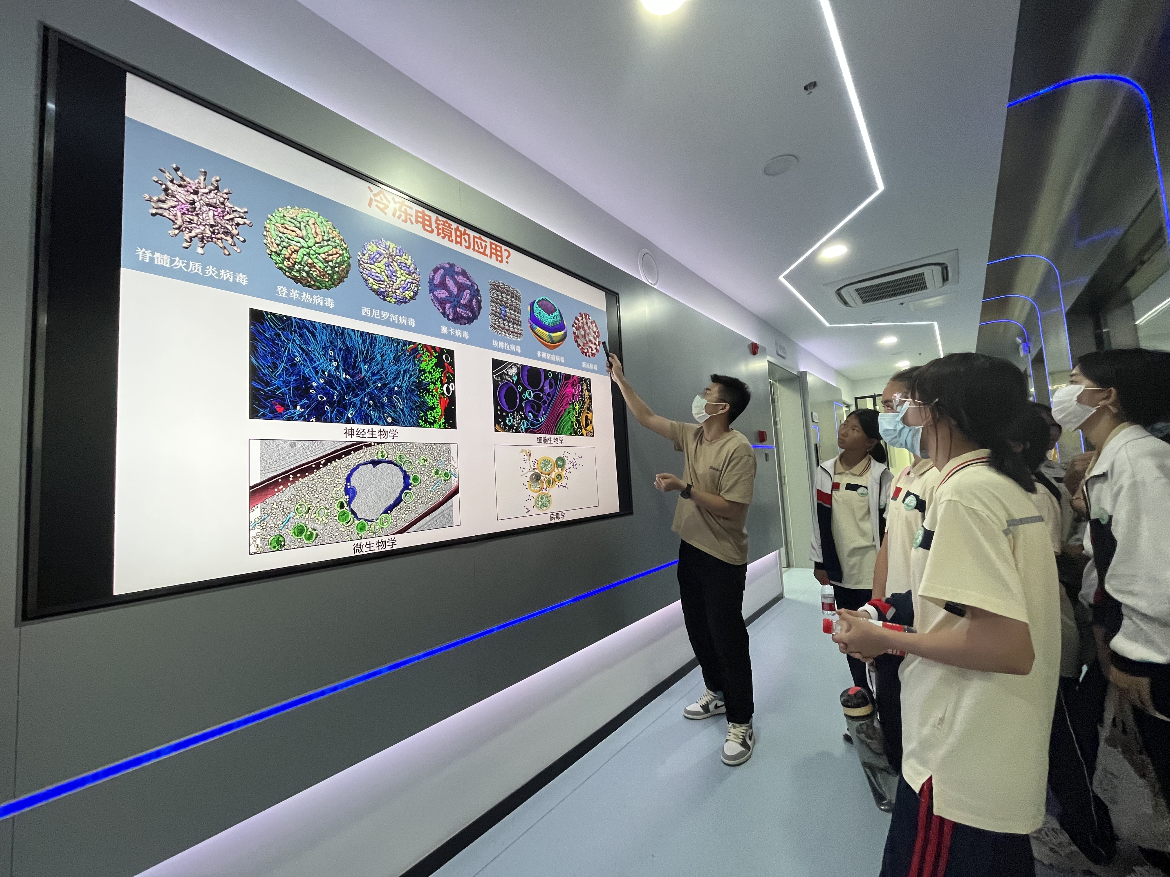 在椭圆楼,同学们参观了科研成果展示区、电镜室、细胞实验区和综合实验区等,认识了HBV、HPV等病毒模型,了解了实验室研发的鼻喷新冠疫苗、HPV疫苗和HIV尿液检测试剂盒等科研成果。其中,让同学们感觉最炫的要属“冷冻电镜结构生物学平台”,在彩灯环绕、充满未来科技感的走廊中,讲解员介绍了电子显微镜的基本原理和构造,展示了冷冻电镜下的各种病毒,并科普了HPV疫苗颗粒结构。这其中用到的制冷剂液氮吸引了同学们的注意,纷纷体验了一次“冻手”乐趣。在聚焦离子束/扫描电子显微镜室,观看了生活中用于面包和馒头发酵的酵母细胞堆叠成“小山堆”的表观形态。此外,讲解员从一个小小的铜网出发,向同学们展示了HPV颗粒成像的流程,在不同放大倍数成像下,让同学们亲自领略了50nm的HPV病毒样颗粒的真实面貌并动手体验了透射电镜的使用,把一张张从模糊不清的图片聚焦到清晰的颗粒图像。通过这一系列的讲解和演示,让同学们对于微观世界也有了更清晰的认知。
