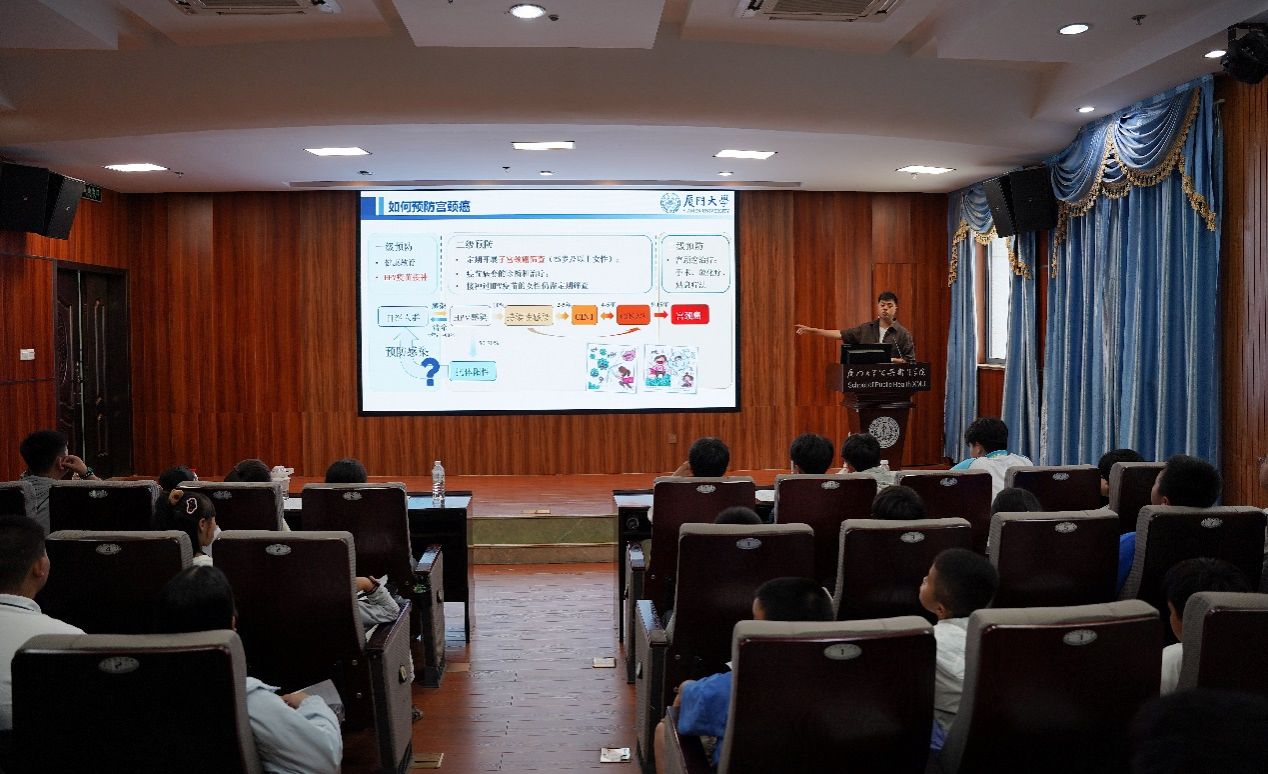 实验室博士生毕兆峰作“预防宫颈癌,从你我做起”的专题讲座,通过动画演示、案例讲解等生动形式,将专业医学知识转化为青少年易懂的科普内容。现场气氛活跃,同学们积极提问交流。
