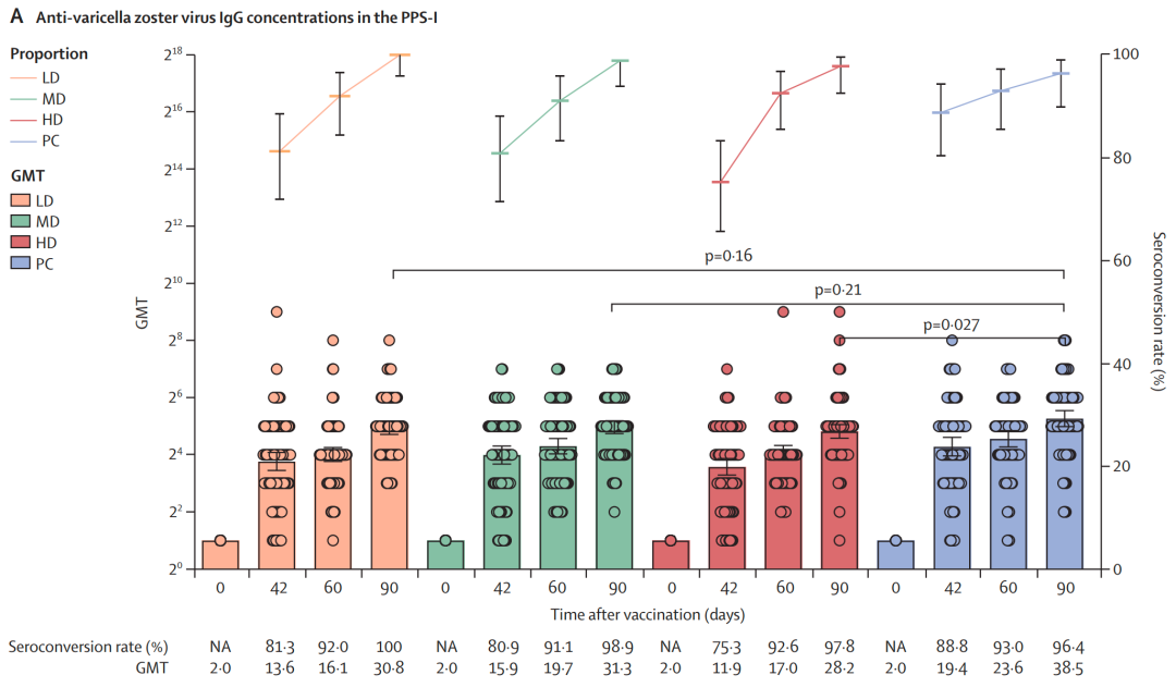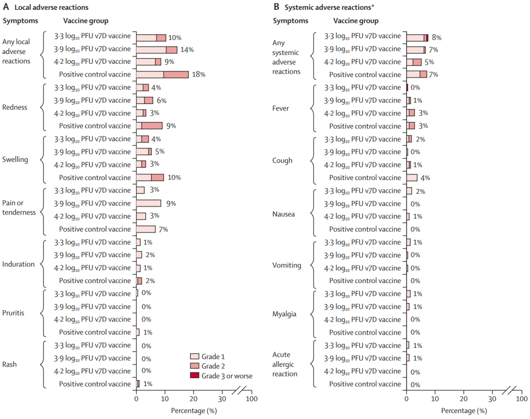 由实验室和万泰生物联合研发的一种嗜神经因子ORF7基因缺失的新型水痘减毒活疫苗(v7D)对人皮肤与神经细胞明显减毒,与现有vOka疫苗相比可能可明显降低疫苗株相关疾病的风险,具有成为新一代更安全的水痘减毒活疫苗的潜力。前期已在临床前和I期临床试验中初步验证了安全性和免疫原性(Nat Commun. 2022; 13(1):824;Lancet Reg Health West Pac. 2023; 34:100707)。为进一步全面评估v7D疫苗诱导的体液免疫和细胞免疫应答,研究团队于2020年在江苏赣榆开展了一项单中心、随机、双盲、阳性对照的IIa期临床研究。研究共入组了842名3-12岁健康志愿者,按1:1:1:1随机分配接种1剂低剂量、中剂量或高剂量的v7D疫苗或阳性对照(vOka)疫苗,评价疫苗的体液免疫及细胞免疫。在符合方案人群中,v7D疫苗的低、中、高剂量组与阳性对照vOka疫苗组的体液免疫应答和细胞免疫应答均相似。免后90天的抗体阳转率分别为100.0%、98.9%、97.8%和96.4%,平均抗体滴度分别为30.8、33.1、28.2和38.5;免后42天的细胞免疫应答阳转率分别为95.5%、90.5%、93.3%和88.0%,IFN-γ水平分别为87.0 pg/mL、122.0 pg/mL、89.0 pg/mL和96.0 pg/mL。v7D疫苗低、中、高剂量组的不良反应发生率低于vOka疫苗组(17%、20%、13%和24%,p=0.025),尤其是局部不良反应(10%、14%、9%和18%,p=0.016)。未发现与疫苗有关的严重不良事件。该研究结果提示v7D水痘疫苗的三个剂量组表现出与vOka疫苗相似的体液免疫和细胞免疫,并且安全性良好。