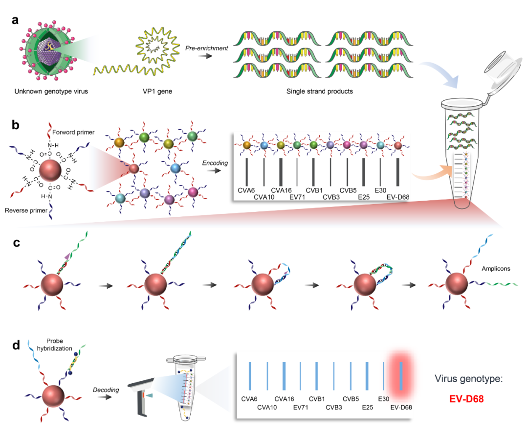 肠道病毒是一类在全球广泛流行的小RNA病毒,每年导致超过10亿例新发感染,引发包括呼吸系统、皮肤、神经系统和胃肠道问题等在内的多样疾病。目前已鉴定出300余种血清型,不同型别的流行此起彼伏,且在疫苗的筛选压力下,非主要型别的比例正在上升,新型别的流行也不断出现。因此,无论是对于医疗救护还是疫情防控,均迫切需要监测和鉴定这些肠道病毒型别。现有的肠道病毒分型技术各有局限:病毒中和试验耗时且复杂;基因测序过程缓慢且依赖专业设备和生物信息学分析;核酸杂交技术能够检测更多型别,但敏感性和特异性不及PCR。单管多重PCR提供了相对快速、灵敏的检测方法,但仅能实现3-4个血清型/管的检测,无法满足众多肠道病毒同时鉴定的需求。而设计无相互干扰的引物对在单管超多重检测中极具挑战,且荧光定量PCR仪器的有限检测通道也制约了靶标数的扩展。
