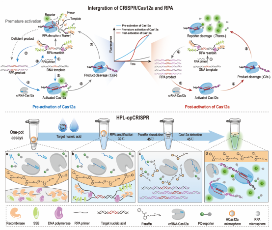 对此,实验室夏宁邵、葛胜祥、张师音团队首先探明并验证了一步法检测中灵敏度低是等温扩增与CRISPR/Cas12a体系竞争扩增模板和产物所导致的;并开发了一种名为HPL-opCRISPR的一管式检测方法,用以克服一管检测中重组酶聚合酶扩增(RPA)和CRISPR/Cas12a系统兼容性差、灵敏度低的问题。该方法应用赋型冷冻干燥技术分别将RPA扩增体系与CRISPR/Cas12a检测体系制备为独立的扩增微球与检测微球,并在检测微球表面包裹低熔点石蜡,制备为热启动CRISPR/Cas12a微球。最后将双微球预装载于同一管中,即可用于检测:首先通过加入的液态模板融化扩增微球,并在相对较低的39℃恒温下进行RPA反应;其后升温至45℃,使热启动CRISPR/Cas12a微球表面石蜡融化,释放检测微球;液相RPA产物融化检测微球后,释放CRISPR/Cas12a检测体系,crRNA-Cas12a被RPA产物激活,反式切割FQ-报告探针,产生检测信号。
