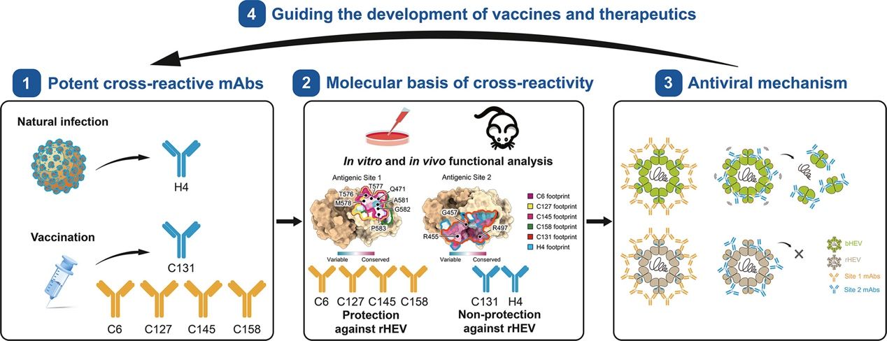 针对上述矛盾点,实验室研究团队通过系统性比对分离自bHEV疫苗接种者与自然感染者的人源抗体盘对bHEV及rHEV衣壳抗原的交叉反应谱及中和谱,鉴定了bHEV抗原既往暴露者所产生的抗体免疫记忆对rHEV感染的潜在保护能力,并对其中关键代表性抗体的性质进行了解构(图1)。