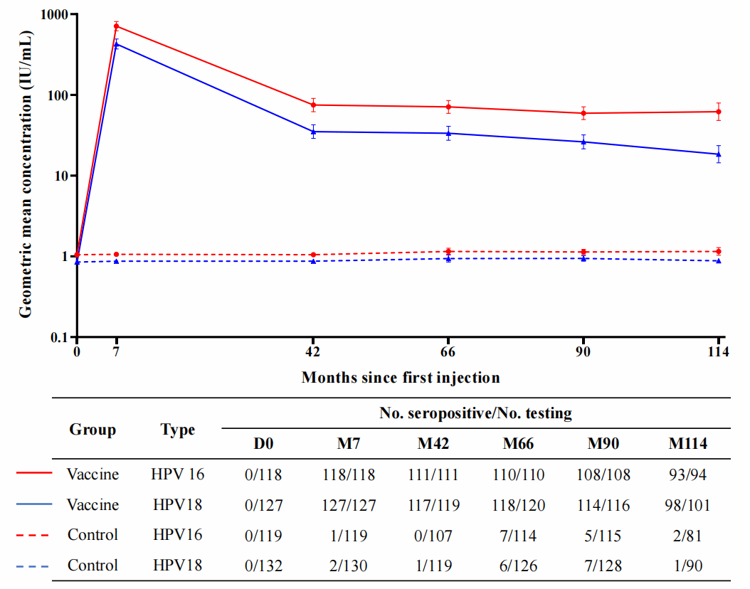 此外,几乎所有接种者在接种后10年仍保持HPV-16/18型中和抗体阳性,抗体水平较自然感染高出数十倍。该研究结果证实,馨可宁®在接种后至少十年内有效预防HPV-16/18相关的高度癌前病变及持续性感染,同时具备优异的免疫持久性,为馨可宁®的广泛应用提供了坚实的证据支持。