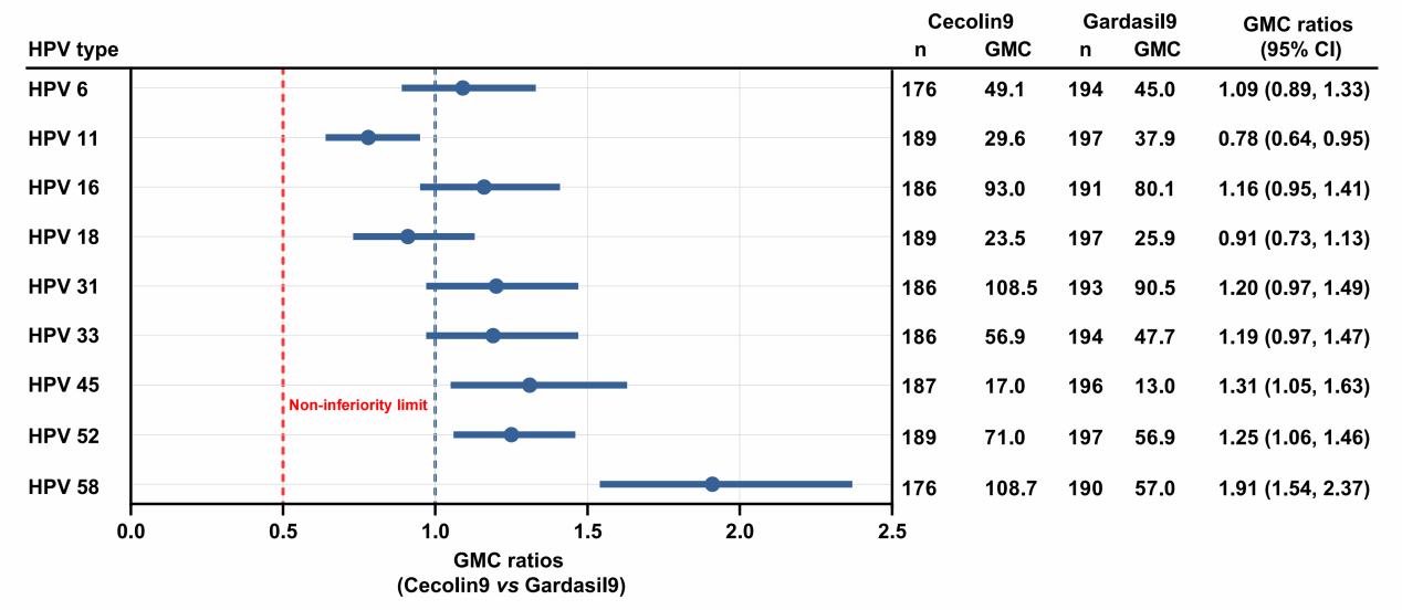 作为临床研发阶段的重要试验之一,研究团队于2021年开展的一项馨可宁®9与Gardasil®9的头对头研究直接比较二者的免疫应答效果。这项严格的随机对照试验证实,18~26岁中国女性全程接种后1个月(第7个月)时,馨可宁®9可诱导出非劣效于Gardasil®9的HPV型别特异性免疫应答,提示其可能具有与Gardasil®9相似的保护效力(Lancet Infect. Dis. 2023)。