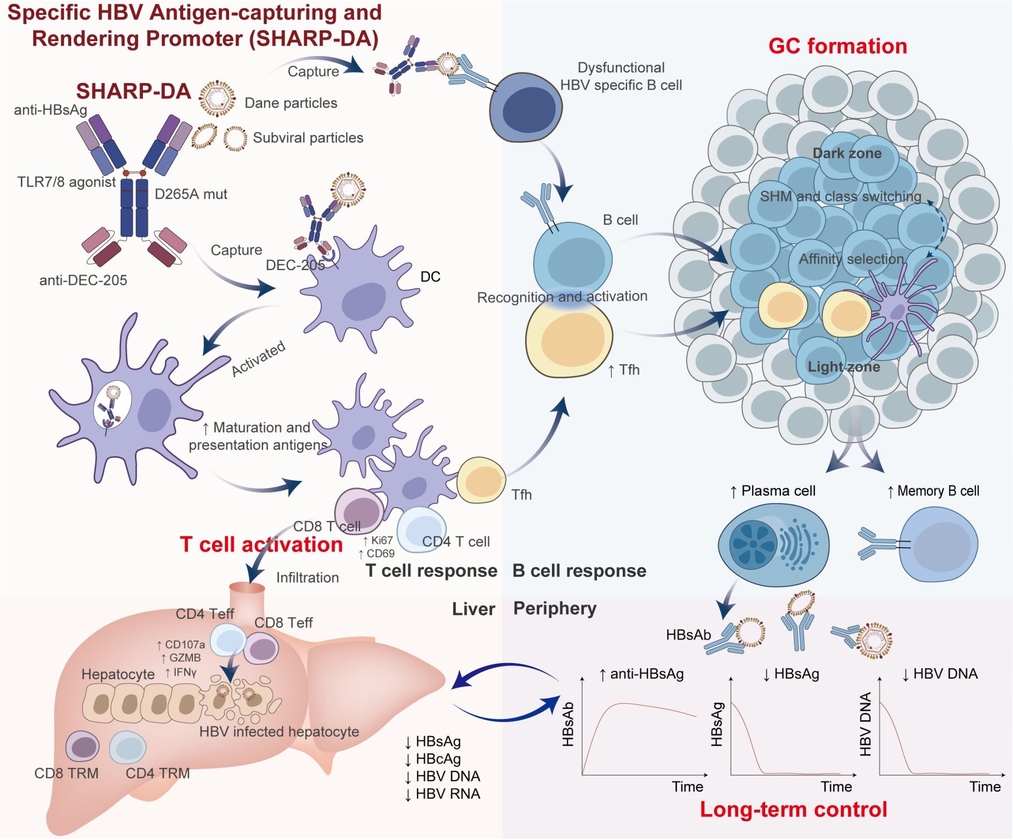针对这一挑战,实验室夏宁邵、罗文新团队基于前期建立的功能化抗体技术平台,成功构建了一类基于双特异性抗体的新型“病毒猎手疫苗”——“特异性HBV抗原捕获疫苗”(SHARP)。通过对靶向HBsAg和DC的功能结构域进行工程化重构,该疫苗被赋予双重功能:一方面具备针对HBV病毒颗粒的靶向识别与清除能力,另一方面可在捕获抗原后实现对DC的内源性抗原靶向递送。进一步地,通过偶联TLR7/8免疫激动剂,该疫苗可强化病毒抗原的吞噬清除,并有效促进DC活化,最终激活HBV特异性免疫应答。数据显示该疫苗能够显著降低血清中病毒及抗原载量,并提升DC对病毒抗原的摄取效率。在HBV慢性感染的小鼠模型中,SHARP治疗可实现长达161天的病毒抗原清除效果,且可诱导机体产生具有保护作用的HBV中和抗体。研究进一步发现,SHARP能够快速刺激体液免疫相关细胞,包括Tfh细胞、生发中心B细胞和浆细胞的比例和数量均上升,在脾脏中诱导活跃的生发中心的形成;并且在SHARP治疗后小鼠生发中心B细胞和浆细胞中IgG相关基因的表达上调,IgA相关基因的表达下调,说明SAHRP治疗促进了B细胞的类别转化,最终通过分泌IgG型别的抗病毒抗体发挥长期保护作用。此外,SHARP治疗诱导了抗病毒细胞免疫应答的恢复,主要表现为HBsAg和HBcAg特异性的CD4+和CD8+T细胞的细胞毒性分子的分泌显著升高。同时,在对功能性治愈的小鼠进行HBV病毒再攻毒的研究中发现HBV无法建立慢性感染,且在免疫后到期的小鼠脾脏组织中检测到显著升高的记忆B细胞和病毒特异性B细胞以及各种记忆T细胞表型比例和数量的显著上调,说明SHARP治疗在慢乙肝小鼠模型中重建了抗病毒免疫记忆,从而实现对病毒感染的长效控制。