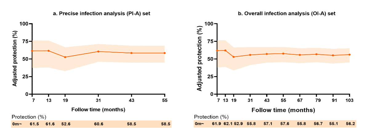 结果显示,自然感染抗体针对HEV感染的保护效果在50%~60%左右并可维持长期稳定。在PI-A的55个月随访中,血清阳性者的HEV感染率为0.8/100人年,显著低于血清阴性者的1.8/100人年,经年龄、性别和居住乡镇校正后,可以降低58.5%(95%CI 44.8~68.7)的感染风险;在OI-A的103个月随访中,对应可以降低56.2%(45.1~65.1)的感染风险;且保护作用在随访期间均未见明显衰减(图2)。研究团队进一步对保护性抗体水平进行了探索,结果显示基线抗HEV IgG浓度与再感染发生风险呈非线性量效关系,抗体水平≥0.25 WU/mL即可将感染风险降低至少50%,而≥5.0 WU/mL者在观察期内无感染事件发生。在临床结局方面,持续10年的肝炎监测共发现10例戊肝患者,其中2例来自血清阳性组,经校正后可降低71.5%(-37.9~94.1)的发病风险;并且,所有6例住院病例均出现在血清阴性组,提示自然感染抗体不仅能降低发病风险,还能显著减轻疾病严重程度。此外,血清阳性感染者的ALT升高幅度更小,抗体增幅更低,进一步支持其临床表现更轻。