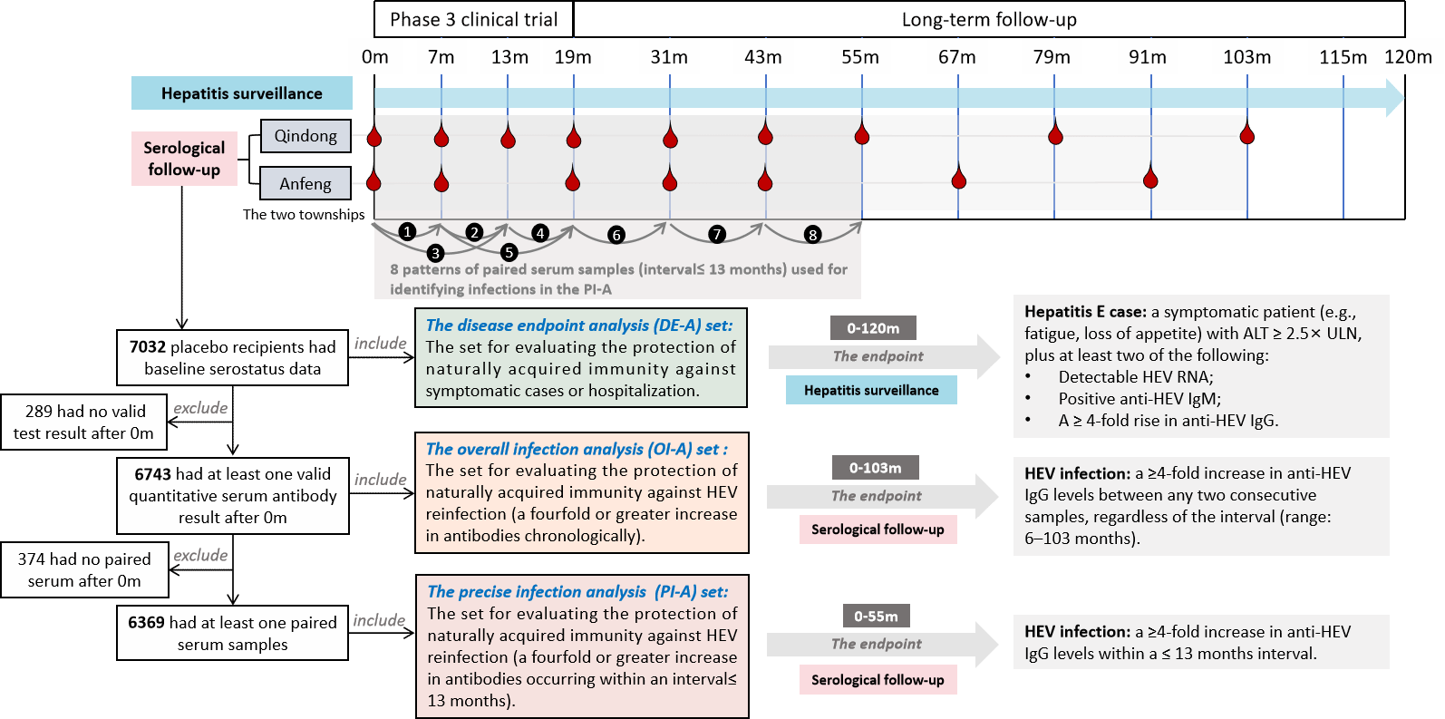 为探究该问题,实验室夏宁邵、张军团队基于此前在江苏省东台市开展的戊肝疫苗(Hecolin®)III期临床试验免疫原性亚组中的长期血清学随访数据进行探索分析,系统评估自然感染抗体对HEV再感染及戊型肝炎的保护作用(图1)。免疫原性亚组中对照组受试者接种的是乙肝疫苗,体内的戊肝抗体由自然感染诱导产生,而前后相邻两份血样的抗体变化情况可用来评估是否发生HEV感染,因此该队列可用来评估自然感染抗体的保护作用。最终,研究纳入7032名具有基线抗体数据的受试者,根据基线HEV IgG抗体状态分为血清阳性(n=3194)和血清阴性(n=3838)两组,并根据不同研究终点和采血间隔设立三个分析集进行评估,包括:(1)疾病终点分析集(DE-A,n=7032),用于评估队列10年随访期间针对戊型肝炎疾病或住院的保护作用;(2)感染终点总体分析集(OI-A,n=6743),覆盖0~103个月内的所有HEV感染事件,相邻两份血样之间的间隔时长不作限制;(3)感染终点精确分析集(PI-A,n=6369),聚焦0~55个月内配对血样间隔时长≤13个月的HEV感染事件。HEV感染定义为配对或相邻的两份血清样本中抗HEV IgG浓度出现至少4倍升高,而临床戊型肝炎则是通过服务于整个III期临床试验及10年延续性观察的肝炎主动监测系统捕获,最终结合症状、ALT升高(≥2.5倍正常上限)及至少两项实验室指标(HEV RNA阳性、IgM阳性或IgG≥4倍升高)确诊。