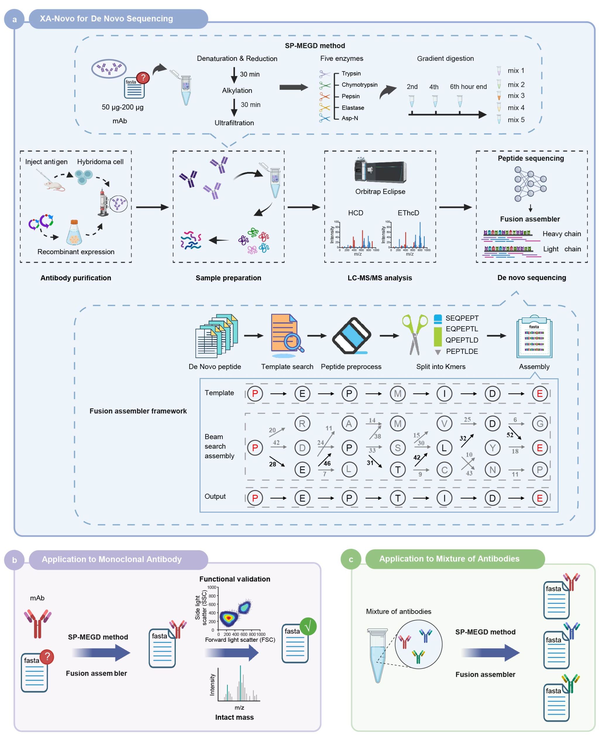 综上,XA-Novo通过整合创新的多酶梯度消化策略(SP-MEGD)、深度学习肽段测序算法以及新型序列组装算法(Fusion),实现了单克隆抗体及混合抗体的高精度序列重建。该技术为抗体序列解析提供了一种高效可靠的新方法,未来有望在抗体发现、免疫组学研究、生物药物质量控制以及抗体工程等领域发挥重要作用,也可为抗体相关研究和药物开发提供关键技术支撑。