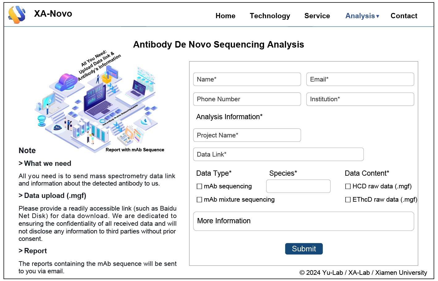 此外,为了方便科研人员使用该技术,团队还开发并上线了XA-Novo网页平台(https://xa-novo.com/)。研究人员只需上传质谱数据(.mgf格式)并填写相应的物种信息,平台即可调用预训练模型与Fusion组装算法,对数据进行抗体序列解析,并生成包含候选序列及CDR区域注释的分析结果报告,为后续抗体序列确认与功能研究提供重要参考。