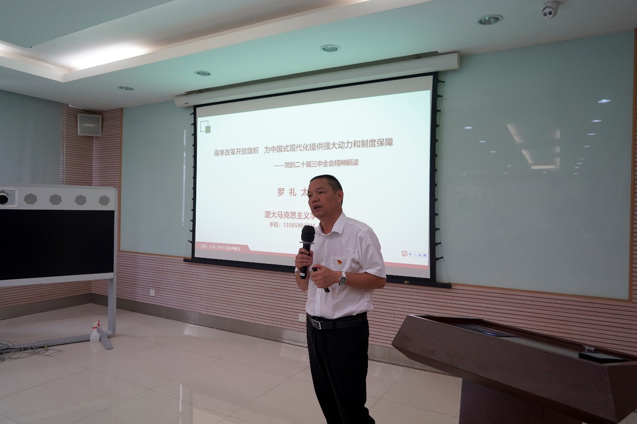 为更好学习贯彻党的二十届三中全会精神,近日,翔安创新实验室党支部联合厦门大学公共卫生学院教工第二党支部、嘉庚创新实验室第一党支部开展联合党建活动,邀请厦门大学马克思主义学院罗礼太副教授为同志们讲授党的二十届三中全会精神。